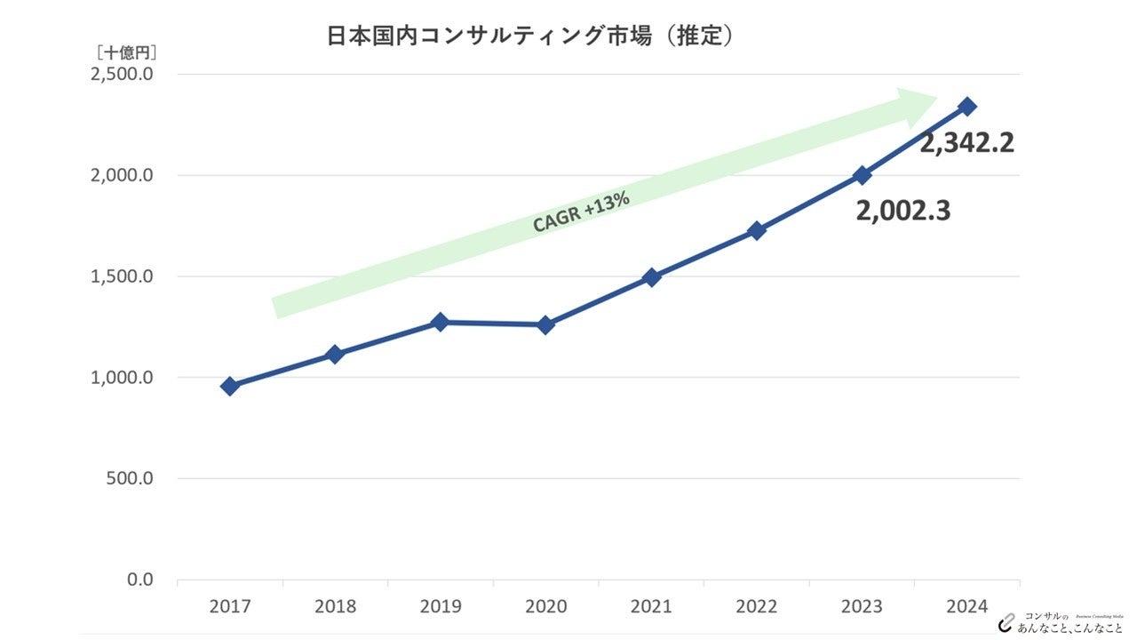 日本のコンサルティング市場は2024年度に2兆3,422億円規模へ拡大し、前年比+17%成長という高成長市場に到達しました。
